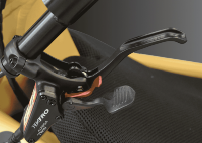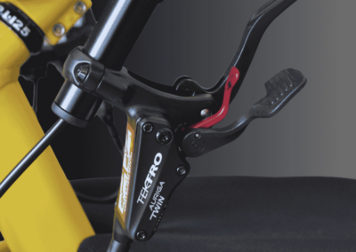 - 3 freins à disques hydrauliques (AR 2x180mm avec étriers mono piston /AV 1x220mm avec étrier 4 pistons)